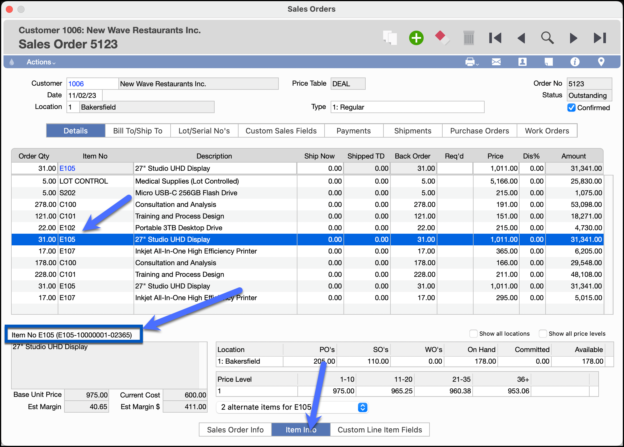 -When the “Long Item No” field is used for a part number, the value will be visible in the Item Info Tab of the Sales Quotes, Sales Orders, and Account Invoice window.